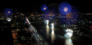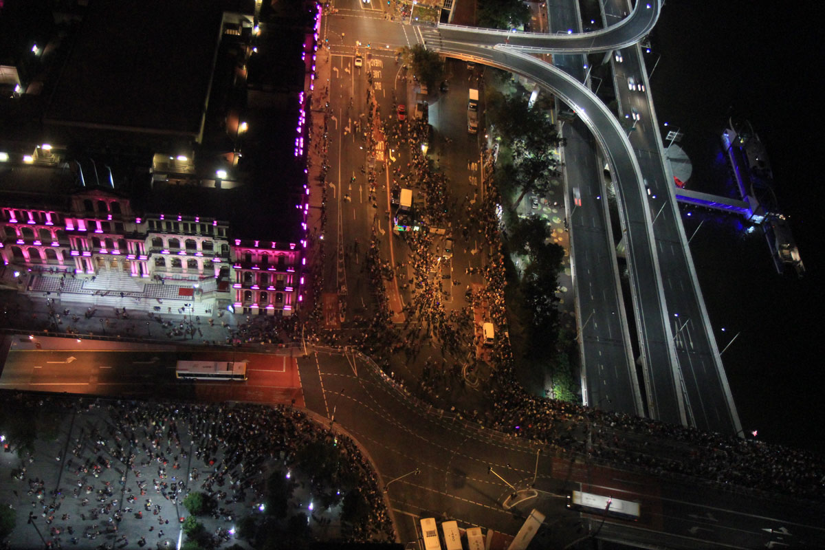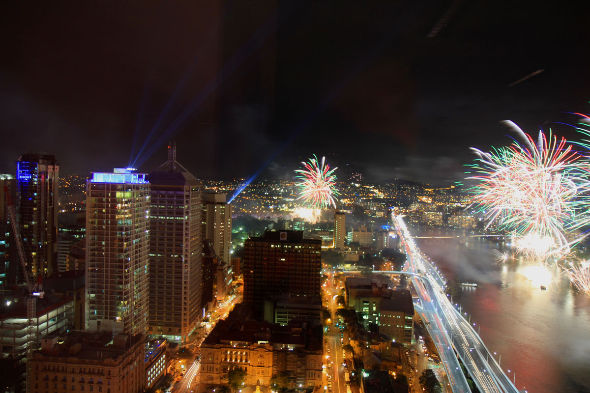 We rushed back from Robowars to Maz’s, and from there to the city, where we parked at Maz’s work, and walked to Brisbane Square—via Subway for a much-needed lunch. We watched the rather pathetic flyover at ten to six, and then, thanks to Bronwen’s friend who works there, joined a ridiculously large queue to get into the Suncorp/Brisbane Square building—though fortunately right at the front of the queue, Bronwen’s friend having held us a place. We set up our cameras against the glass of the 33rd floor, and got a new, and rather high, view of the Riverfire fireworks and myriads of little tiny ant-people down below.