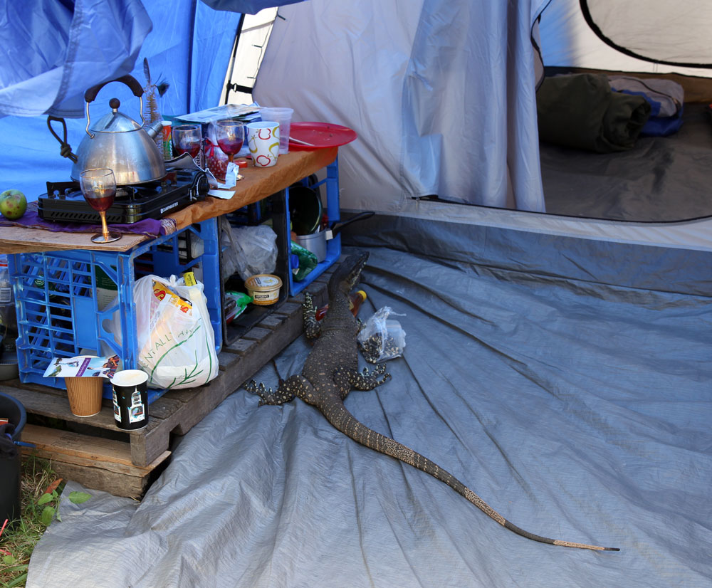 I slept in until it became too hot and I felt too sick and had to get up. A goanna came and ate some of the food from a nearby tent and a goanna catcher came and caught it, and its friend, and ran them off further into the bush.