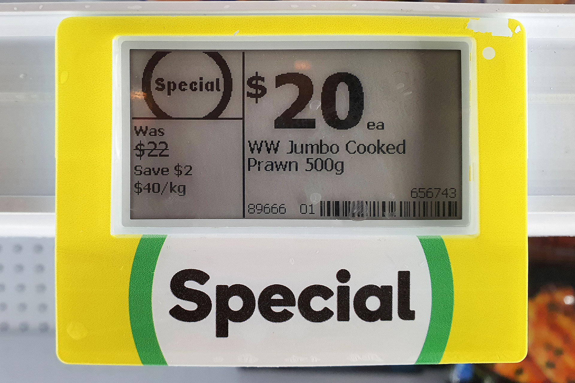 After our swim we rushed to Bunnings Keperra to try to buy a pump-up squirt bottle to spray anti-possum mixtures on Bronwen’s possum-eaten tree, but the one we wanted was out of stock, so we rushed on to Woolworths Keperra, arriving just before it shut. The entire store has switched to electronic price tags.