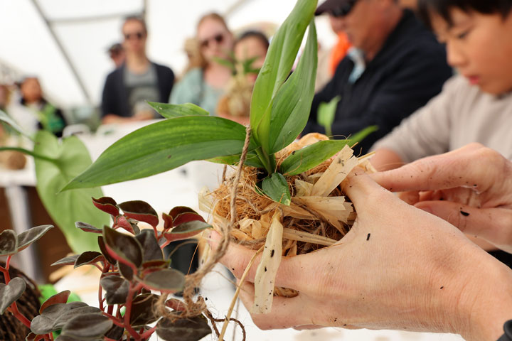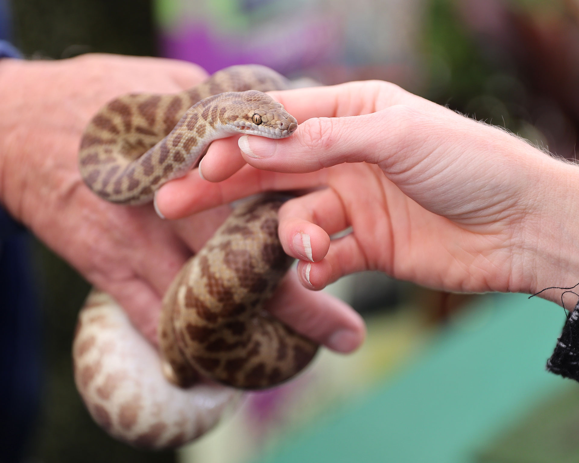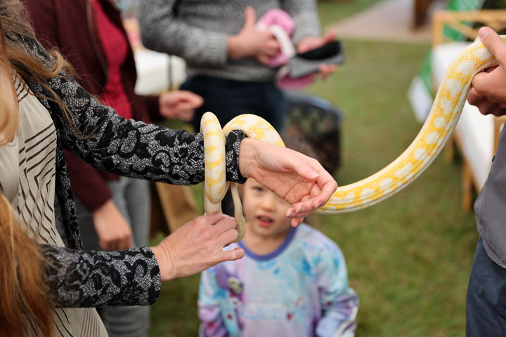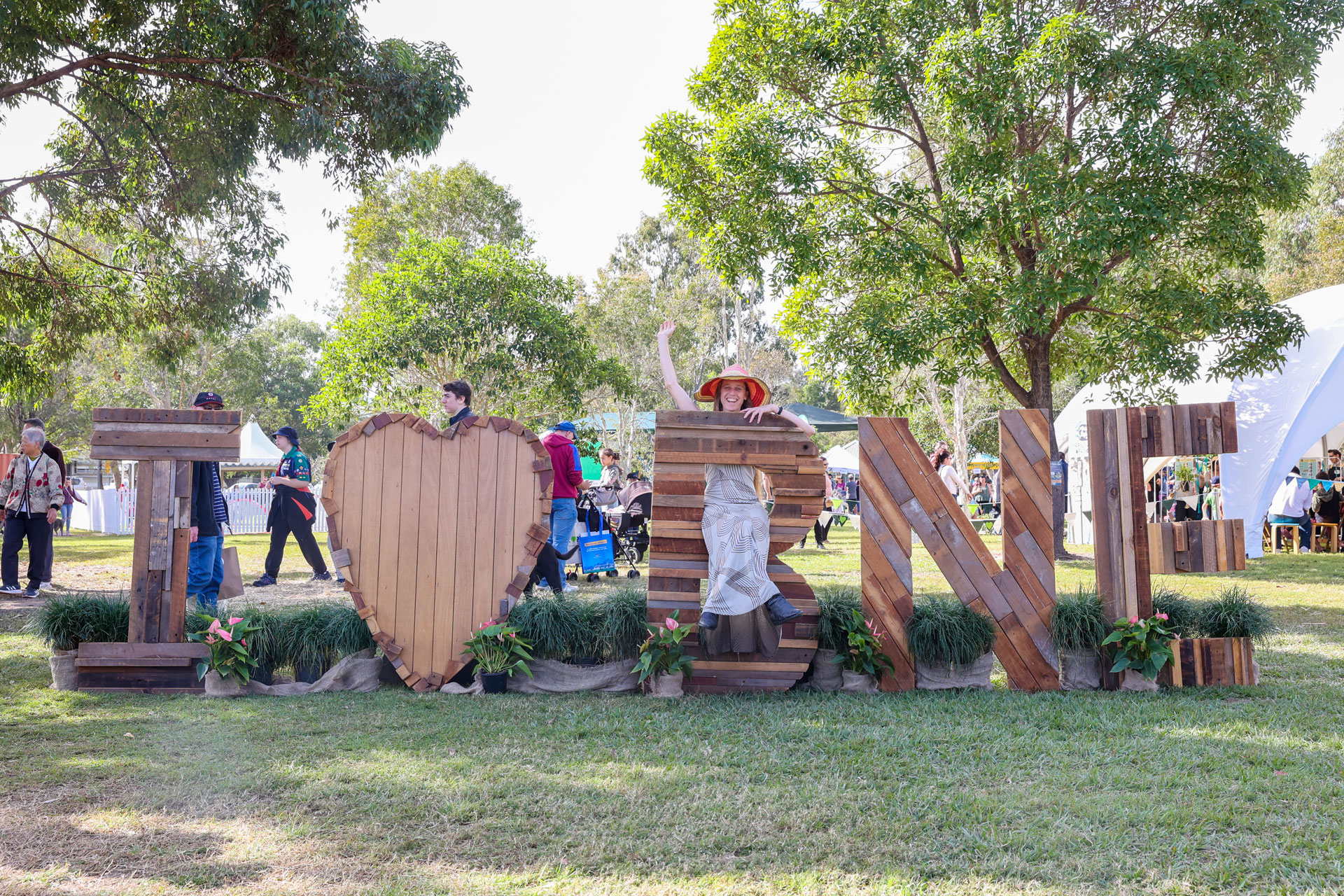 After looking at many cars we drove to 7th Brigade Park in Chermside and had a look at the Green Heart Fair. Apparently people go to this quite early too—we got there just after it opened at 9 AM, and it was already very busy. Bronwen met a shiny yellow snake and made a hanging plant, so was happy.