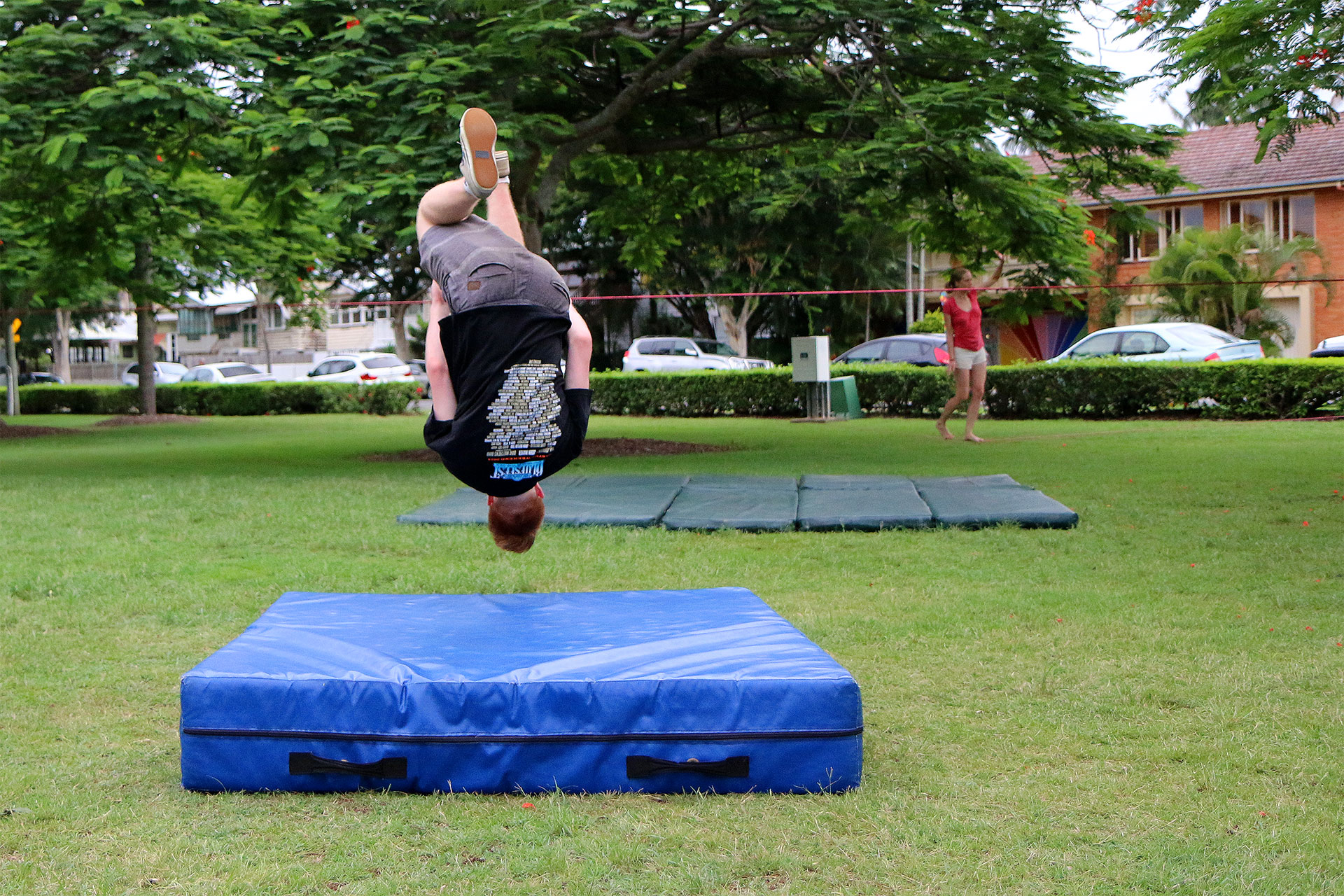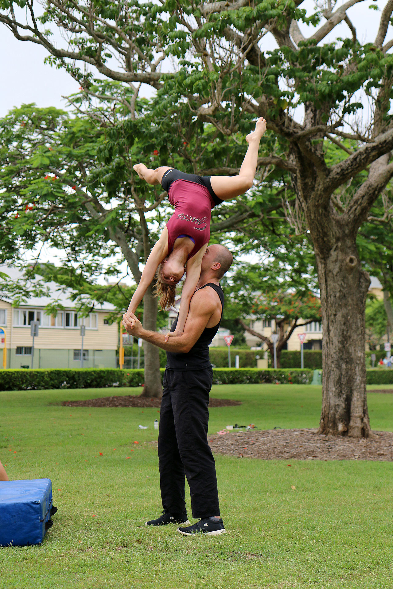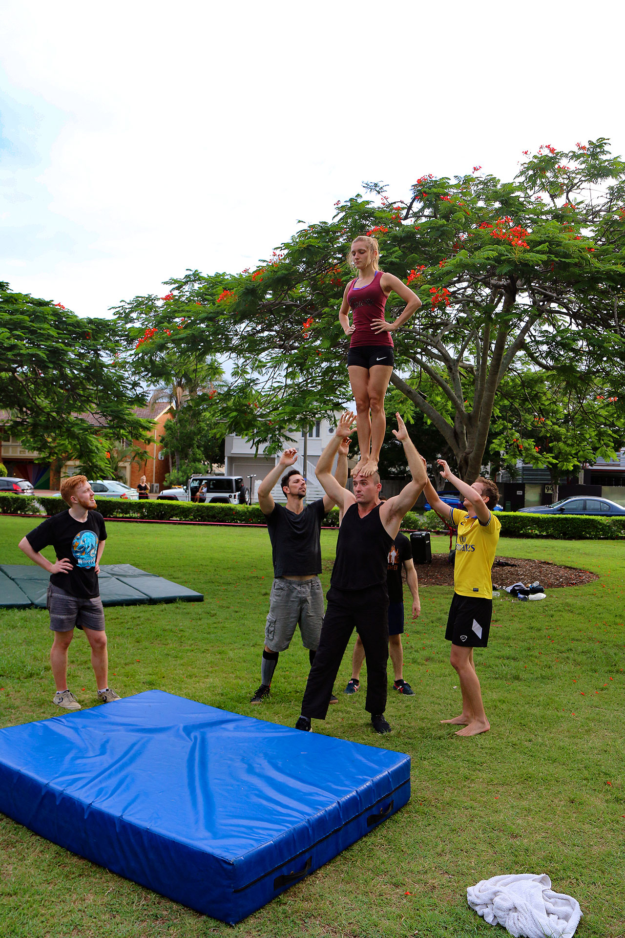 After our brief retail therapy, we continued on to New Farm Park where we had intended to buy some chips. However, the some chips shop was shut, so we went to Coles where I had them make me a mixture of pasta and potato salad and Bronwen bought an awful orange cake even though I told her it would be awful. We then ate them while watching the slackline and acro crews practicing in the park.