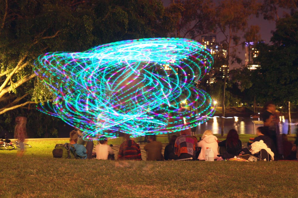 After this we drove to Francy’s Patisserie in Rosalie for breakfast, then drove up to Bronwen’s parents’ place, and then to a Bastille Day celebration at Park Road (which was quite unexciting—a handful of stalls mostly advertising things which didn’t seem to have any connection to the French—I got a bag of lollies and a pen with a LED light in it), and then to The Sunset Gathering at Kangaroo Point (with fairies, circus pandas, and a smattering of fire-twirling, pois, hula-hooping, and head-standing and general all round fun) with some chips we’d bought from Rosalie, and then to Livewired Comedy at The Powerhouse (which sadly wasn’t as funny as usual—though the headline act was quite hilarious).