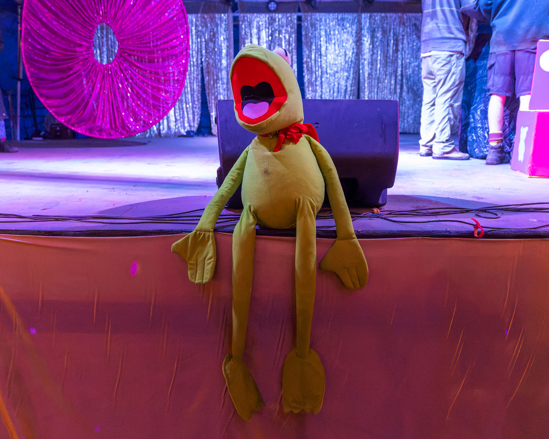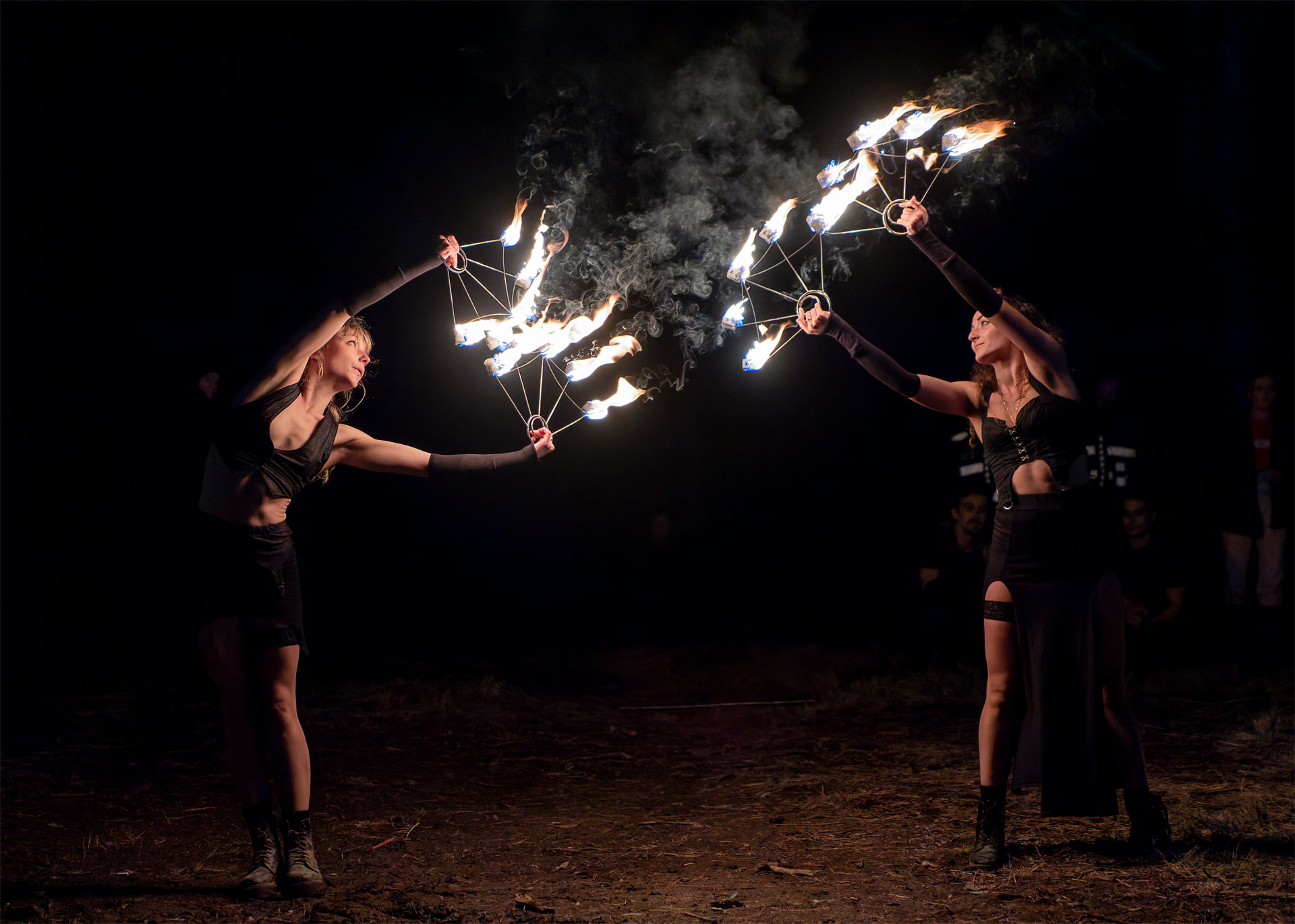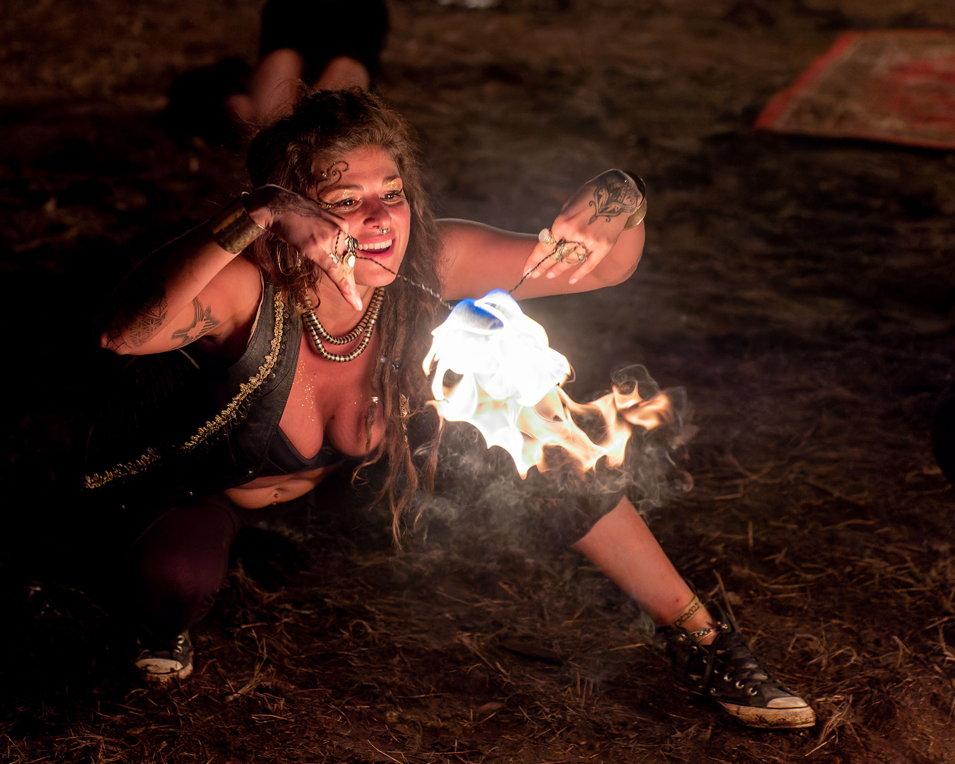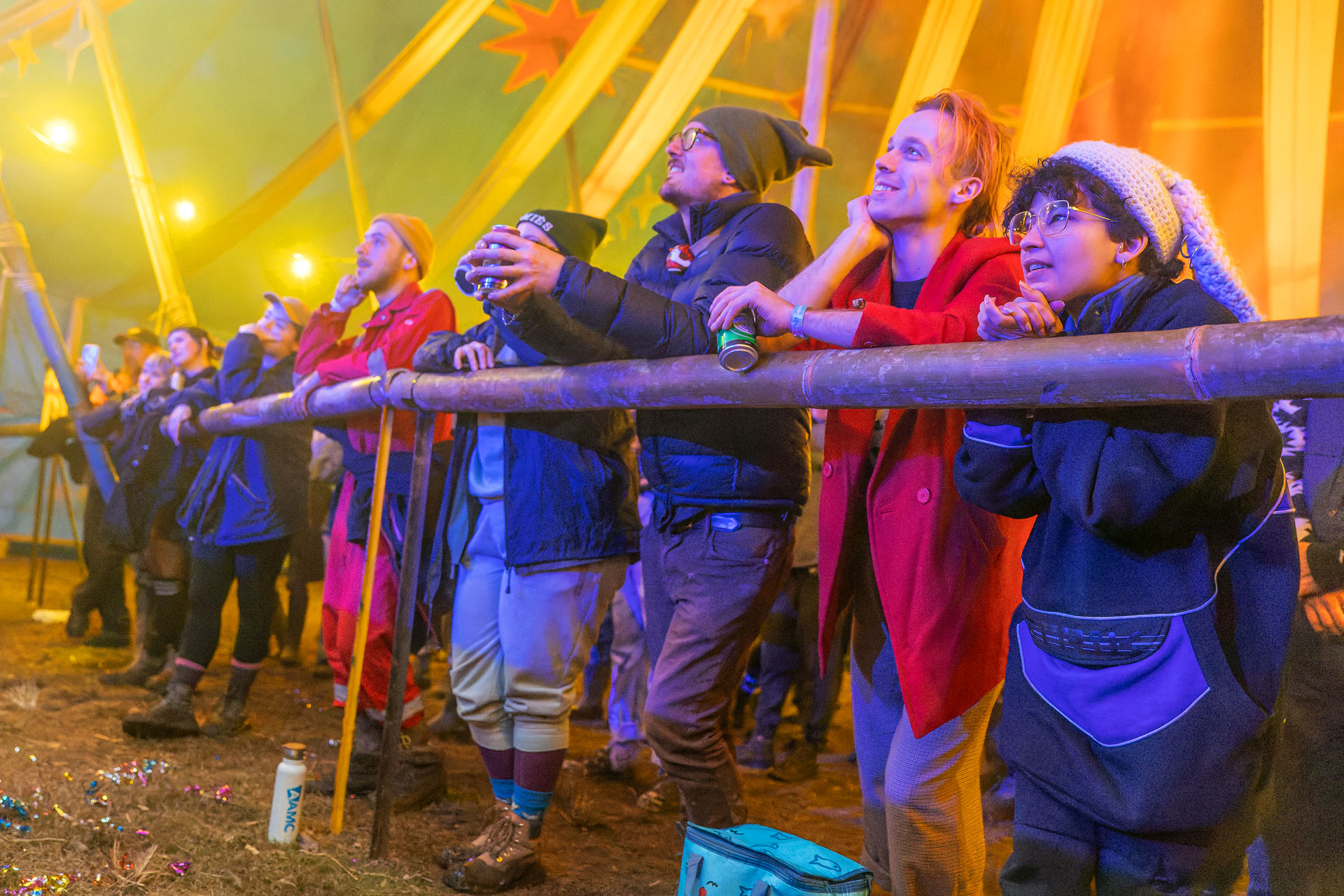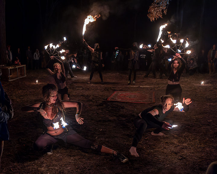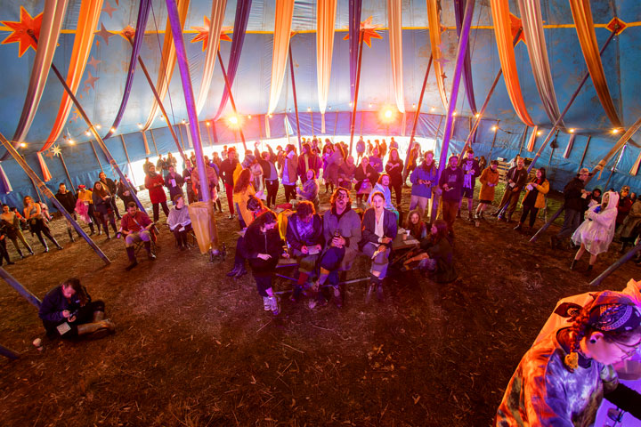 By night the rain had returned. I slid from venue to venue, hiding my camera gear under my umbrella and trying to follow the crowds to whatever exciting thing was on, without succumbing to the mud. I spent a lot of time around the various large fires scattered across the site, drying, warming, and chatting.