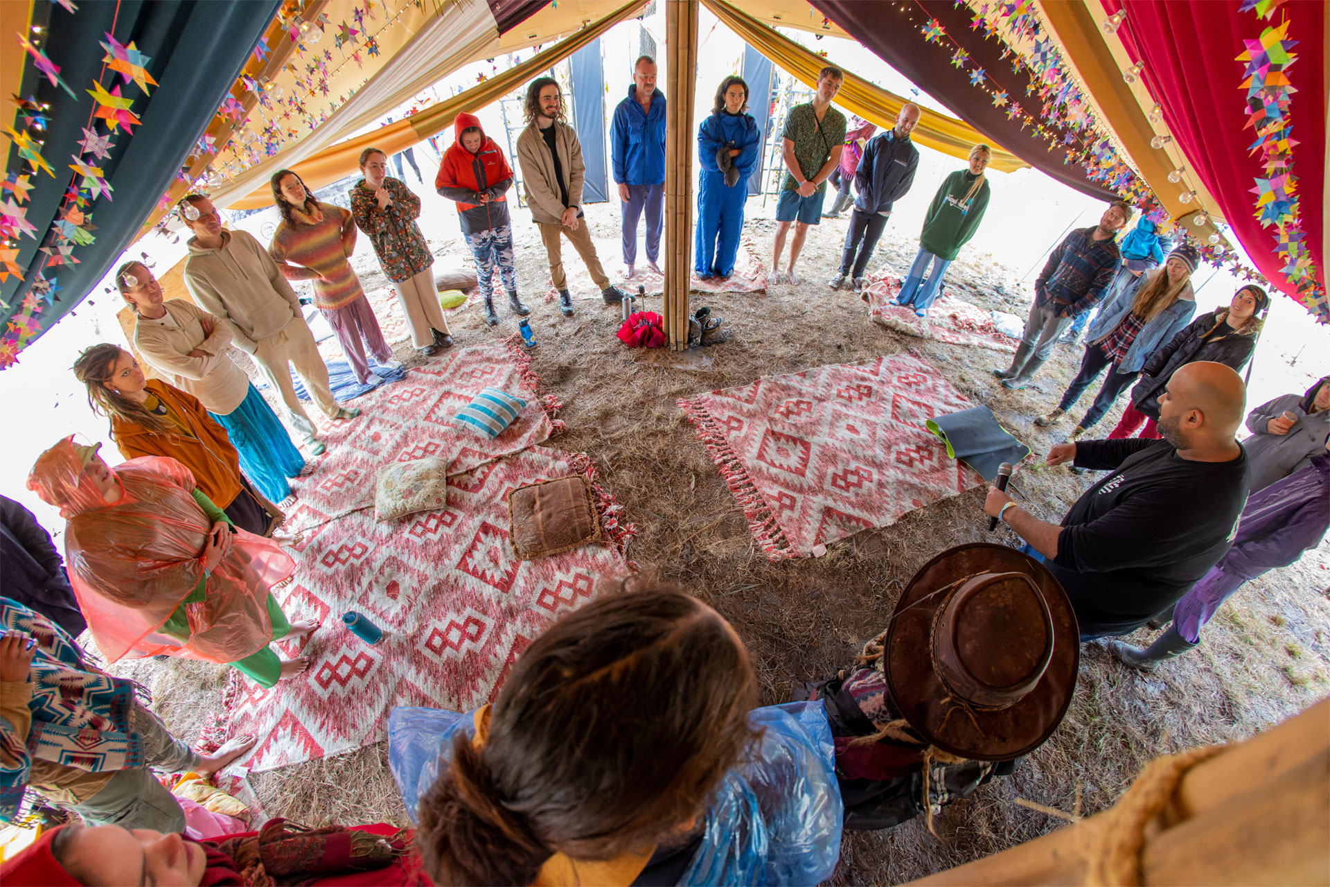 I got back to my tent to find that the tarp—which I’d set up very hastily in the dark yesterday—had filled up with rain and collapsed. Amazingly, it had collapsed in such a way that my tent and all my gear were perfectly dry underneath it—I just couldn’t get to them. After doing what I should have done last night back when things were dry—putting up some extra poles and a lot more pegs into the now-very-wet ground in the dark—I managed to hopefully get the tarp to stay up, and went to bed. The cool weather made for a cosy night’s sleep—a nice change from the more traditional festival sweat-fest I’m used to.