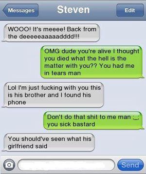 [Steven] Lol I’m just *** with you this is his brother and I found his phone
