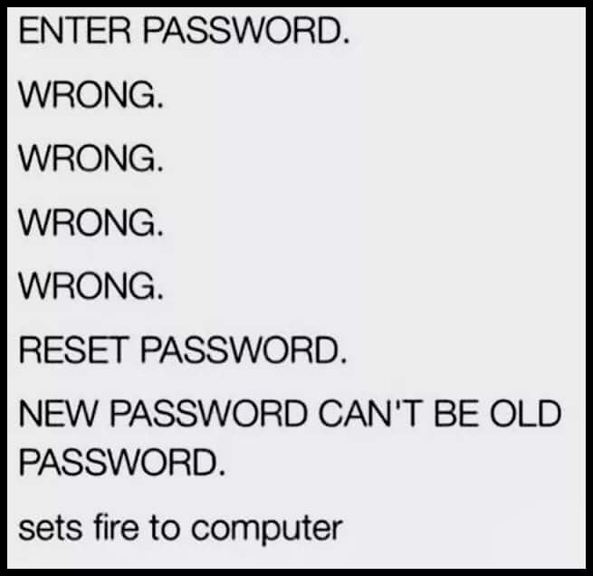 Enter password. Wrong. Wrong. Wrong. Wrong. Reset Password. New Password Can’t Be Old Password. Sets fire to computer.