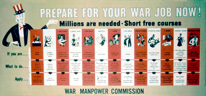 Poster Text: PREPARE FOR YOUR WAR JOB NOW! / MILLIONS ARE NEEDED - SHORT FREE COURSES / IF YOU ARE . . . / WHAT TO DO . . . / APPLY . . .