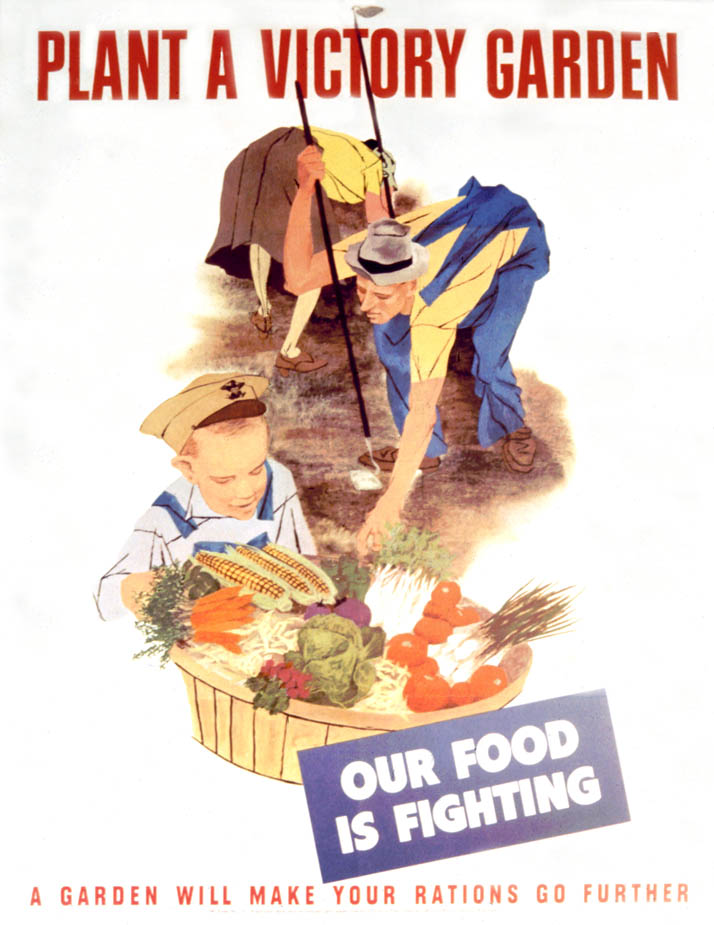 Poster Text: PLANT A VICTORY GARDEN / OUR FOOD / IS FIGHTING / A GARDEN WILL MAKE YOUR RATIONS GO FURTHER.