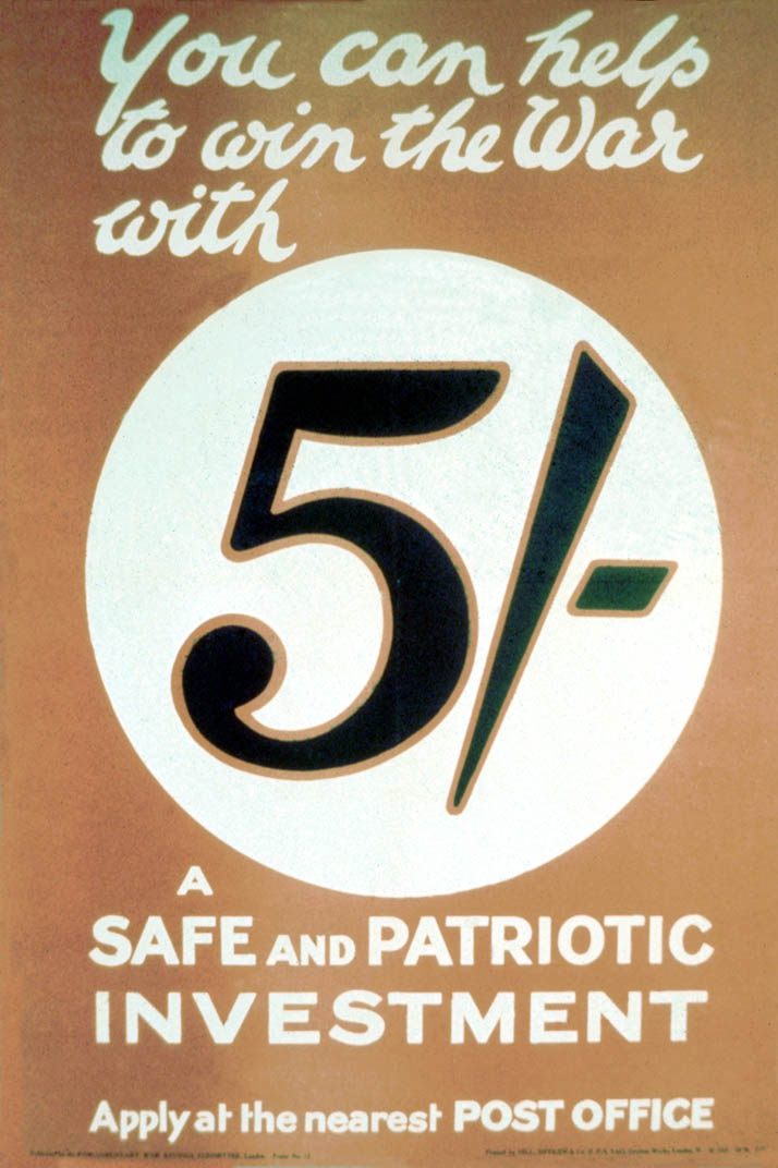 Poster Text: YOU CAN HELP / TO WIN THE WAR / WITH 5/- / A / SAFE AND PATRIOTIC / INVESTMENT / APPLY AT THE NEAREST POST OFFICE.