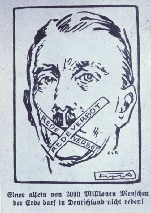 For a period in the 1920’s, Hitler was forbidden to address public meetings in much of Germany, which was a major blow to the Nazi propaganda apparatus. This poster, by cartoonist Philipp Rupprecht (most known for his cartoons for Julius Streicher’s Der Stürmer) is captioned: He alone of two billion people on earth may not speak in Germany.” Courtesy of Dr. Robert D. Brooks.